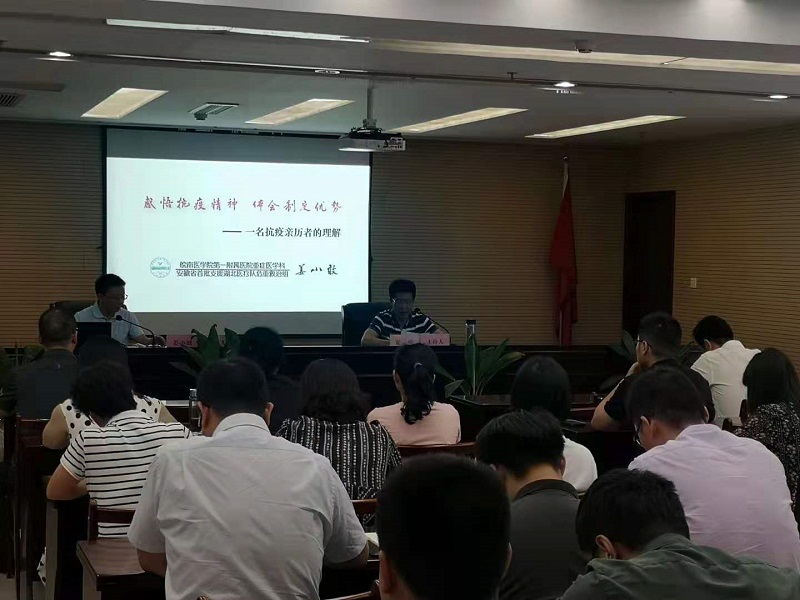 作為安徽首批援鄂醫(yī)療隊(duì)總負(fù)責(zé)人,姜小敢主任曾帶領(lǐng)團(tuán)隊(duì)分別在武漢太康醫(yī)院、協(xié)和東西湖醫(yī)院、肺科醫(yī)院開(kāi)展了“疫情阻擊戰(zhàn)”、“疫情圍剿戰(zhàn)”和“疫情殲滅戰(zhàn)”。姜主任從抗疫經(jīng)歷回顧、感悟抗疫精神、體會(huì)制度優(yōu)勢(shì)等三方面回顧和分享了他馳援武漢抗擊疫情的經(jīng)歷和體會(huì)。一幅幅身臨一線的圖片、一段段飽含深情的話語(yǔ),生動(dòng)再現(xiàn)了疫情發(fā)生后,全國(guó)各地醫(yī)護(hù)人員、防疫人員、共產(chǎn)黨員及社會(huì)各界不怕危險(xiǎn)、不怕?tīng)奚鸱烙《镜膱?jiān)強(qiáng)堡壘的感人事跡。那一段段用生命守望生命的故事讓現(xiàn)場(chǎng)的每位聆聽(tīng)者心靈都受到強(qiáng)烈震撼和感動(dòng)。